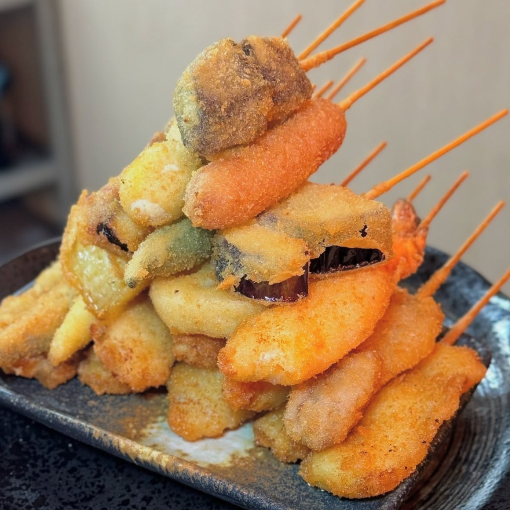 大阪名物といえばやっぱり串カツ!「らっしゃいセー」では、揚げたてサクサクの串カツを90分食べ放題2,500円で楽しめます☆